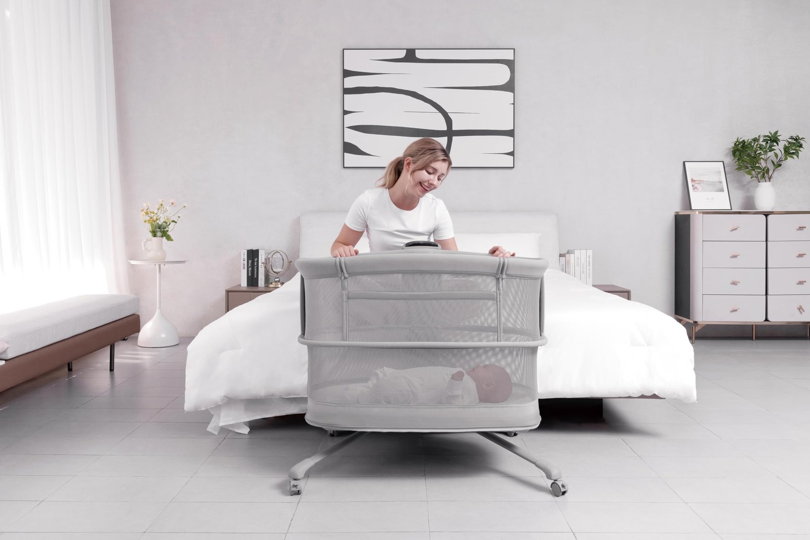 CONCEPTION PRATIQUE POUR LES PARENTS – La paroi latérale rabattable et le berceau amovible permettent de garder bébé près de soi.