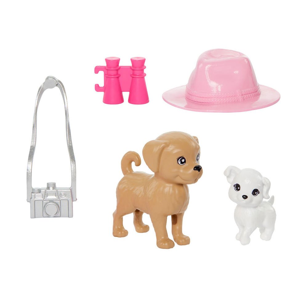 - Les enfants (à partir de 3 ans) peuvent imaginer des aventures en famille avec des accessoires comme un appareil photo, des jumelles et un chapeau d’été, ainsi que deux chiots !