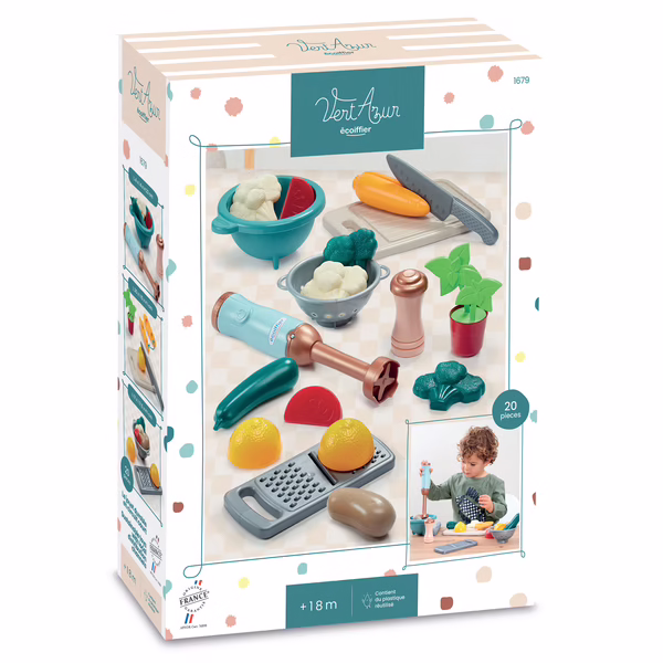 Ensemble de cuisine comprenant 1 mixeur plongeant, 1 bol, 1 passoire, 1 planche à découper, 1 couteau, 1 râpe et des légumes pour préparer une bonne soupe ! Dès 18 mois. Origine France Garantie.