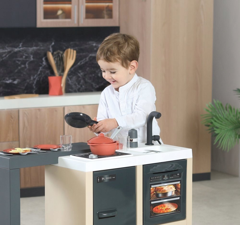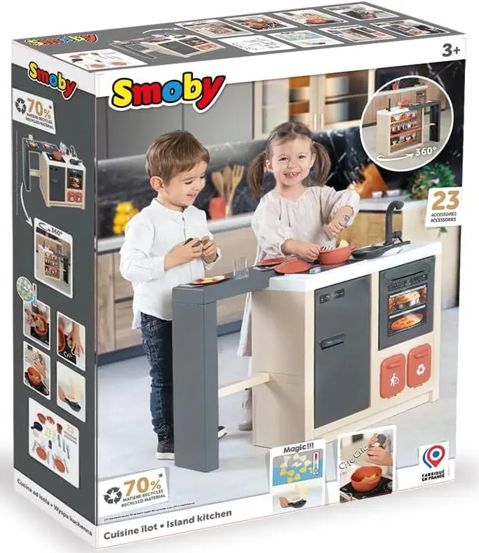 Une cuisine moderne et fonctionnelle pour les petits chefs en herbe ! Inspirée des tendances actuelles, cette cuisine au design contemporain offre à votre enfant un espace de jeu à 360°, idéal pour cuisiner et interagir avec ses amis autour d’un îlot central. Elle intègre toutes les fonctions traditionnelles : un large coin repas ou plan de travail, un frigo, un four, une table de cuisson avec bouton cric-cric, un évier avec robinet au design tendance, deux poubelles de tri. Votre enfant pourra s’immerger pleinement dans le jeu grâce aux 23 accessoires inclus : poêle avec lanceur, casserole avec couvercle, crêpe, pâtes, moulin à poivre et sel, assiettes, couverts, verres et ustensiles de cuisine. Fabriquée en France, cette cuisine contient de la matière recyclée, pour un jeu responsable et durable. Convient aux enfants à partir de 3 ans.