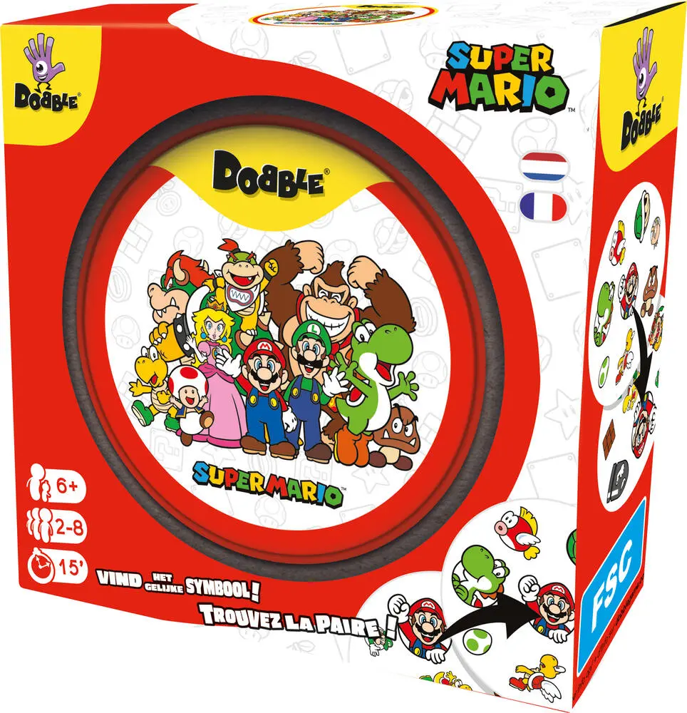 Dobble au Royaume Champignon ! Retrouvez tous les personnages et symboles de la saga Nitendo Super Mario : Mario, Luigi, la Princesse Peach, Browser, Yoshi, etc. Dobble est un jeu testant votre rapidité et votre sens de l’observation. Le but est simple : être le premier à trouver le dessin identique entre deux cartes. De 2 à 8 joueurs. 15 minutes.