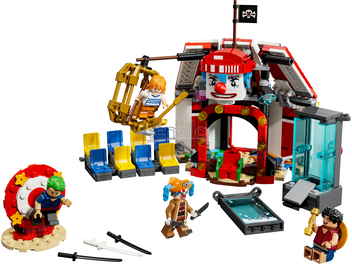 Le set inclut les minifigurines de Luffy, Zoro, Nami et du capitaine pirate Baggy le Clown. Le chapiteau à construire peut être retourné pour créer un grand espace de jeu avec des chaises amovibles et le trône de Baggy. Les héros doivent tenter de s’échapper de 3 attractions : un réservoir d’eau, une table verticale tournante et une cage suspendue. Le chapiteau contient des cartons et des barils avec des éléments pour construire une version miniature de Baggy, ainsi que des armes et des accessoires dont 2 affiches « Wanted ». Pour s’amuser davantage, les constructeurs peuvent zoomer, faire pivoter les modèles en 3D et suivre leur progression avec l’appli LEGO Builder.