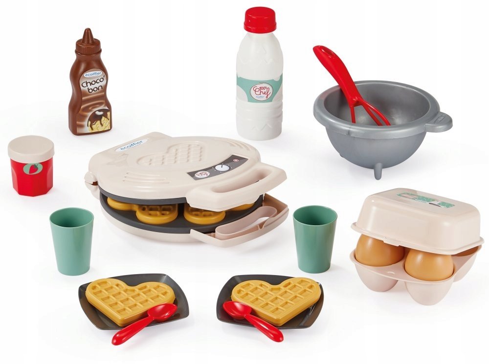 Ce gaufrier ECOIFFIER constitue un jeu de simulation parfait pour les enfants dès 18 mois. Ce set inclut un gaufrier, quatre moules à gaufres en forme de cœur, confiture, chocolat, une dinette pour deux personnes, des œufs, du lait, un saladier et un fouet. Idéal pour des collations créatives et ludiques.