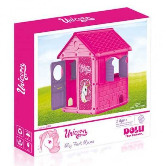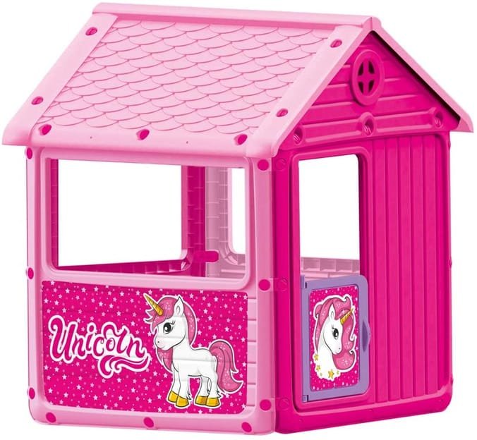 La maison de jeu Dolu My First Unicorn est une maison de jeu extérieure magique pour les enfants de 2 ans et plus ! Il se décline dans une couleur rose vif, avec un toit effet tuile rose pastel et des motifs licornes, ainsi que deux portes et grandes fenêtres.