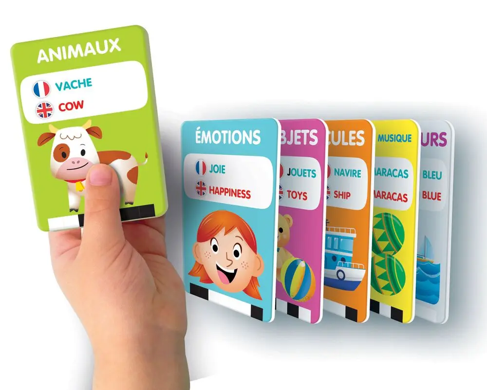 Le jeu éducatif comprend 50 cartes doubles face pour apprendre 100 mots en français et en anglais et dispose de 2 modes de jeu par carte : découverte et quiz.