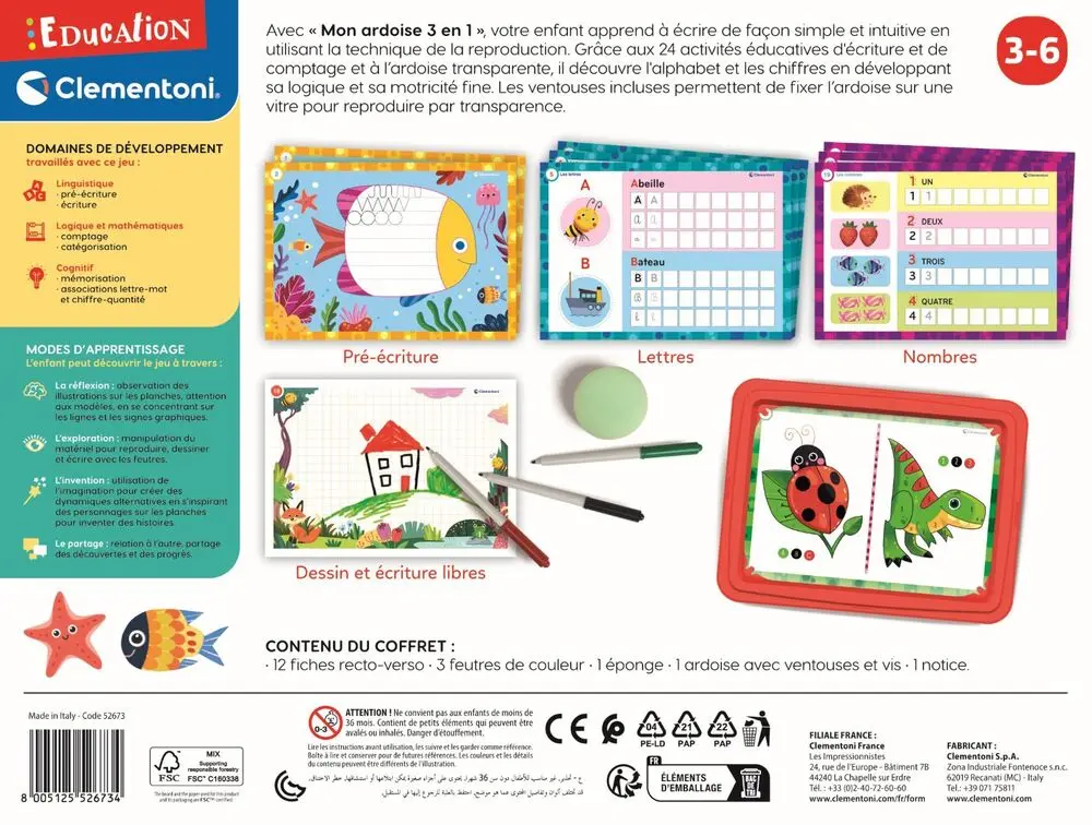 Un jeu parfait pour apprendre l’alphabet et de nouveaux mots, en développant le langage, les capacités manuelles et l’attention. Grâce à l’ardoise spéciale dotée d’un plateau transparent, d’un feutre et de nombreuses fiches contenant des activités de pré-graphisme et de pré-écriture, apprendre à écrire est simple et amusant. Une aide précieuse pour faire découvrir aux plus petits le monde de l’écriture.