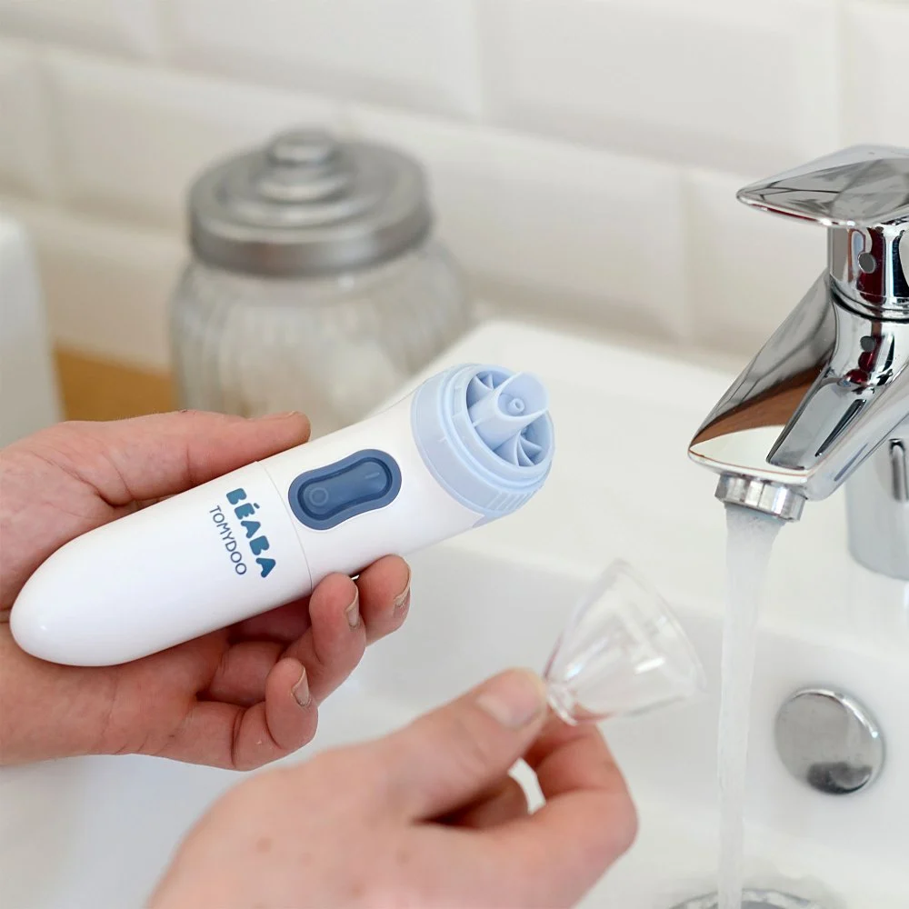 Mouche-bébé électrique évolutif nomade. Mouche bébé évolutif : Accompagne l’enfant dans sa croissance grâce à ses différents embouts. Aspiration en quelques secondes : Facilité accrue en obstruant la narine opposée. Embout nourrisson (0 à 3 mois) : Forme affinée. Embout sécrétions normales et embout sécrétions épaisses : S’adaptent à l’évolution de l’encombrement nasal de l’enfant. Embout silicone : Matière souple et douce. Tête amovible : Démontage et nettoyage facilités. Accessoires : Pochette de rangement. 3 embouts…