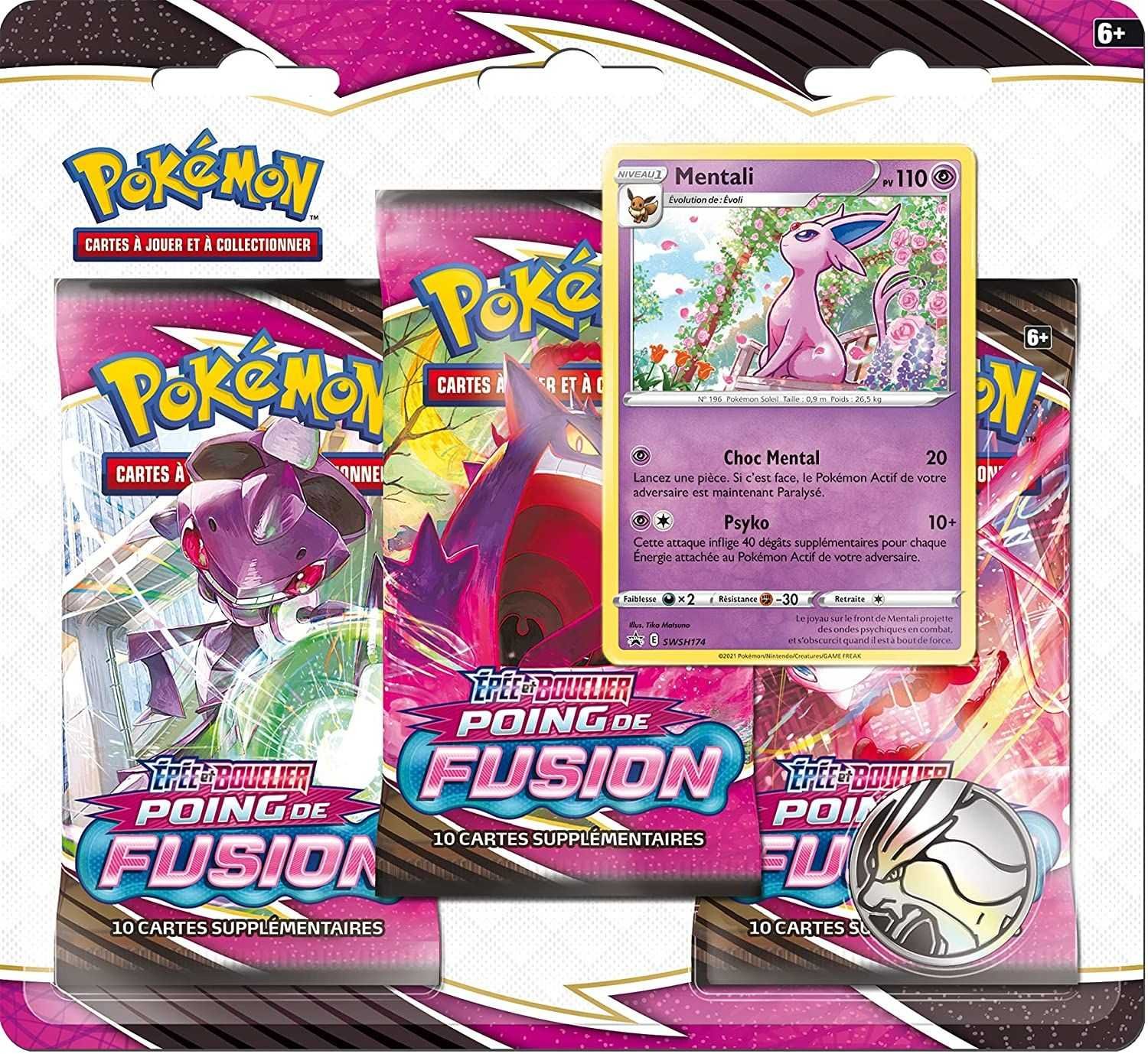 Tri-Pack Mentali. Pack contenant 3 Boosters Pokémon VF de la série EB08 Poing de Fusion, ainsi qu’une carte promo Mentaliet une pièce.