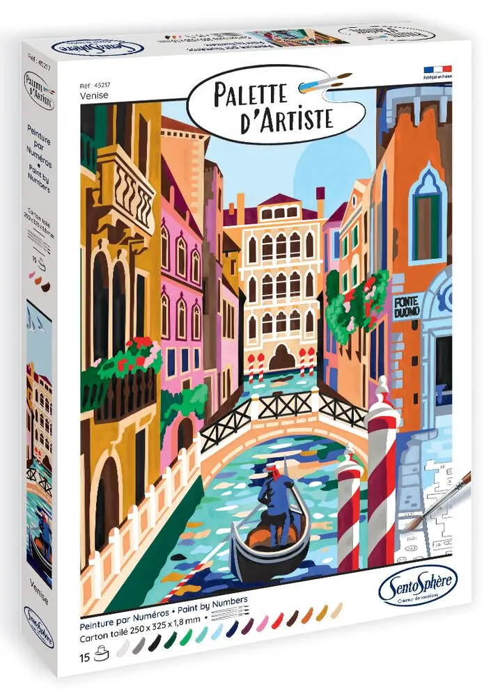 Laissez-vous porter par l’éclat des couleurs avec la peinture par numéros Palette d’Artiste – Venise. Faites apparaître, couleur après couleur, ses canaux et ses ponts emblématiques, ses bâtiments aux teintes chaudes, pour recréer la magie de cette ville romantique.