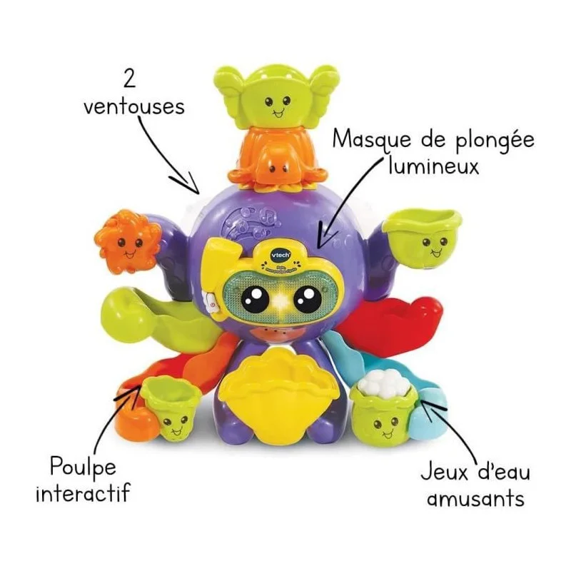 Polo, mon poulpe rigolo – Un compagnon de bain interactif pour s’amuser dans l’eau ! Les tentacules du poulpe comportent de multiples accessoires et permettent jusqu’à 10 manipulations différentes dans le bain. Deux ventouse situées derrière la tête de Polo permet de le fixer à la paroi de la douche ou de la baignoire. Quand on appuie sur son visage, il s’illumine et lui donne une apparence encore plus rigolote. 2 accessoires : un verseur crabe et un verseur tortue. 3 chansons et 15 mélodies. Effets sonores et lumineux.