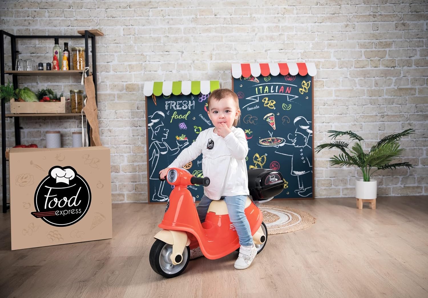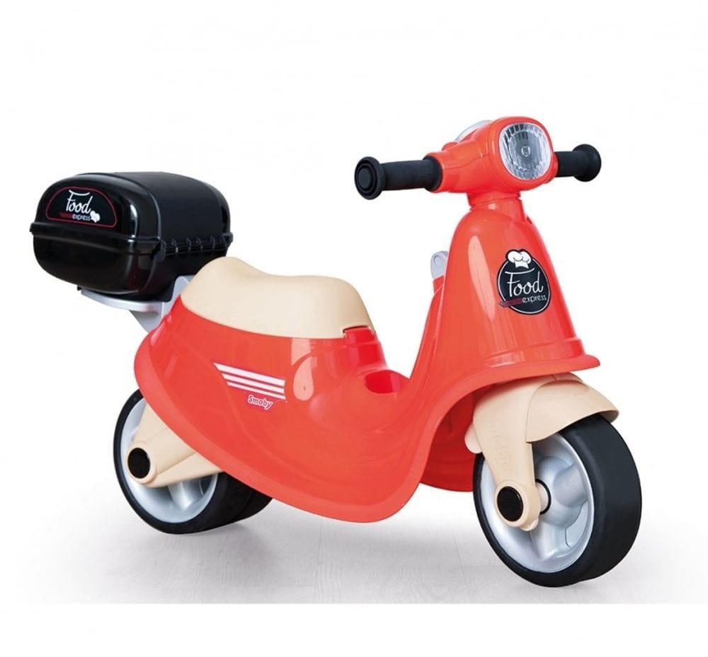 Pizzas, burgers, sushis, faut vite aller livrer les commandes aux clients. Tout bon marchand de pizza possède un scooter de livraison. Ce porteur pour enfant au design moderne et coloré s’inspire donc des scooter de livreurs.