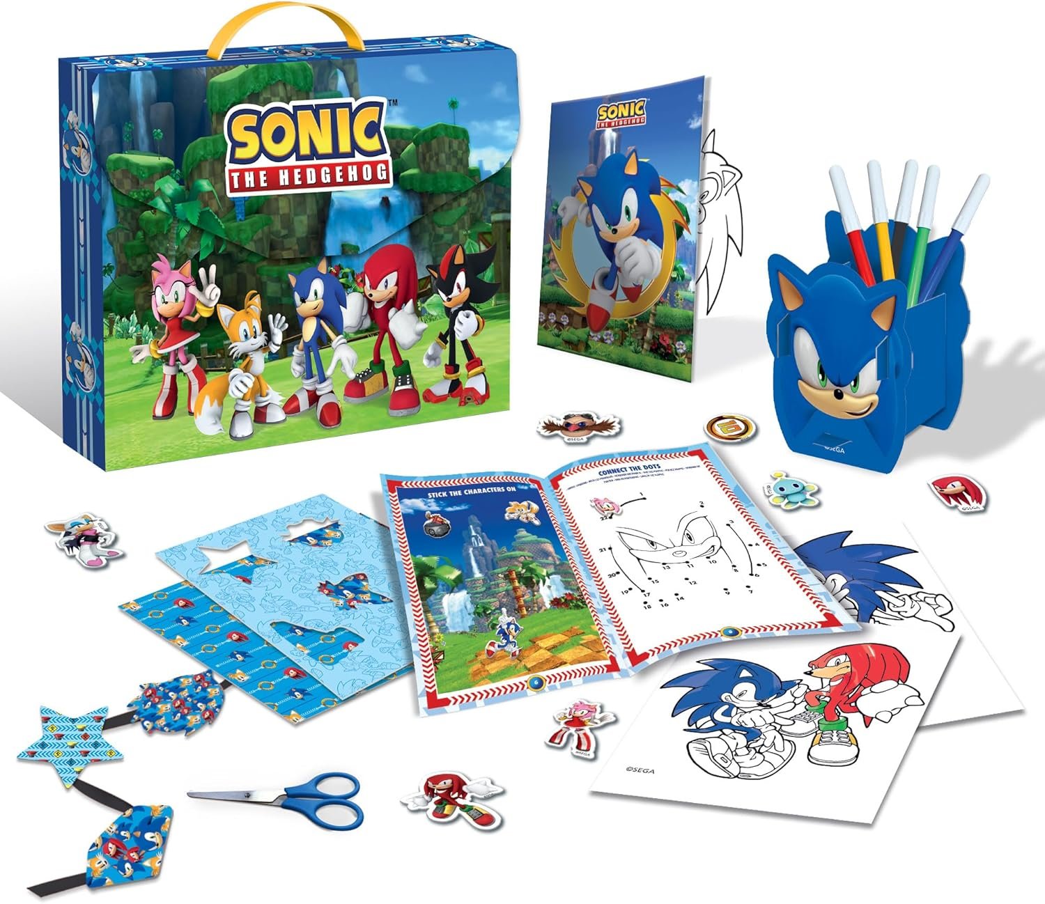 Contenu dans la magnifique mallette de Sonic, un fantastique kit de bureau pour avoir tout ce dont tu as besoin avec toi ! À l’intérieur, tu trouveras tout ce dont tu as besoin pour colorier et dessiner tes personnages préférés, un magnifique porte-stylo à construire et de fantastiques autocollants pour personnaliser tes créations.