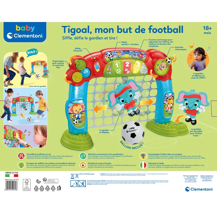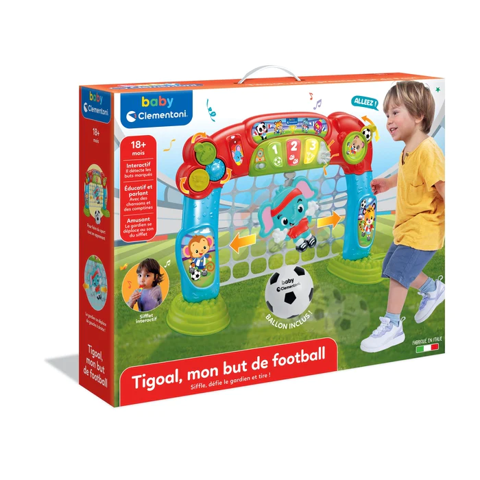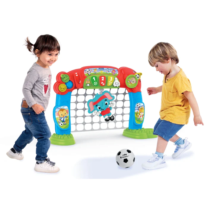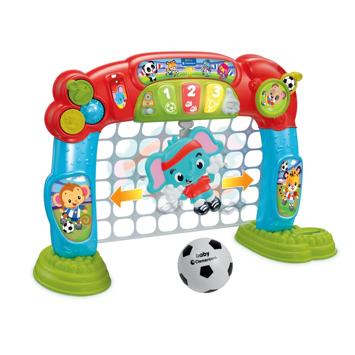 Avec la balle en caoutchouc souple, adaptée à la taille des petits joueurs, ce sera un plaisir de marquer ! Lorsque le ballon touche son filet, ton compagnon de jeu compte les buts et applaudit tout en émettant des effets sonores amusants.