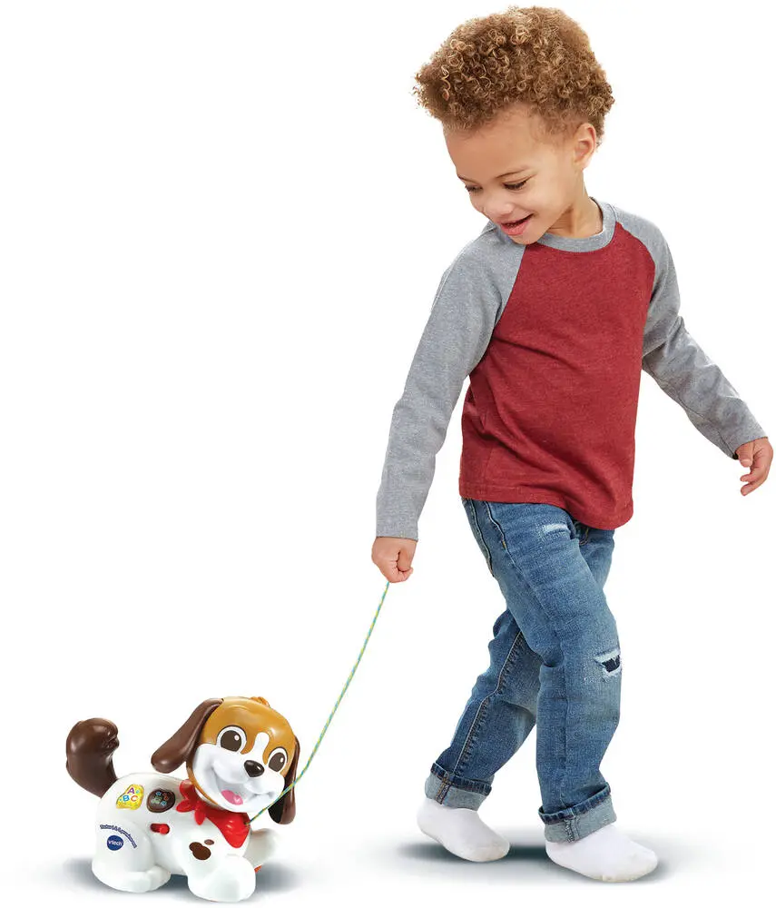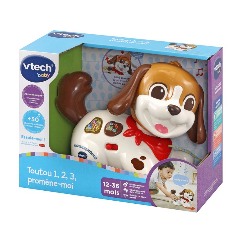 Toutou, 1,2,3 Promène-moi – 12 – 36 mois Un petit chien interactif tout mignon à câliner et à promener partout !Lorsque Bébé fait rouler le petit chien avec la laisse, il déclenche des phrases et des sons amusants grâce au détecteur de mouvement. Il avance en se dandinant et en bougeant la tête pour inciter l’enfant à le suivre. 2 boutons lumineux permettent aux tout-petits de découvrir les premiers mots en écoutant des chansons, des mélodies et des anecdotes sur les chiots. Trop mignon, lorsque Bébé appuie sur la tête de Toutou, ses oreilles s’animent ! Trop rigolo, la queue de Toutou est pivotante. Bébé peut la faire tourner !Rangement de la laisse dans le compartiment à piles. + de 50 chansons, mélodies, sons et phrases. Réglage du volume sonore et arrêt automatique. Fonctionne avec 2 piles LR03 fournies.